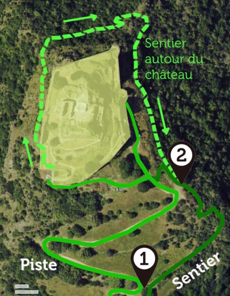 Si vous ne le savez pas... le cheminement d'accès au château n'est pas à ce point difficile. 15 minutes sur une large piste, certes pentue. Du coup, nous recherchons au contraire un peu de difficulté et de "sentier nature" ! En 2021, les visiteurs ont le choix sur l'approche du château... et un sentier de montagne offre désormais la possibilité de faire le tour du monument, juste en-dessous. Ce sentier autour du château s'effectue en 15 minutes, et offre des vues exclusives... A découvrir sur place !