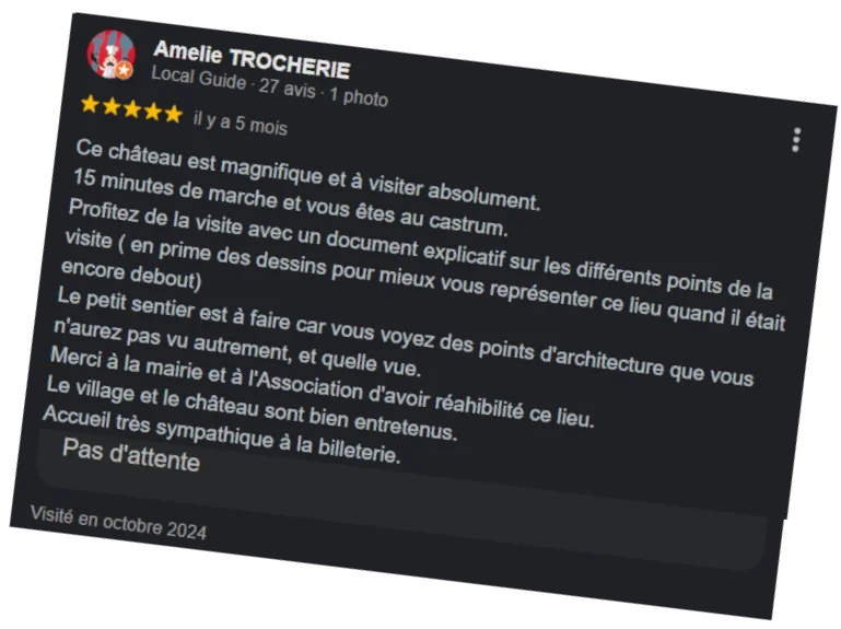 Les 1000 ans d'histoire sont évoqués, le siège de 1210 détaillé, les vestiges explicités, avec une médiation complète, notamment grâce à notre concept de "Cahier illustré en prêt", plébiscité.